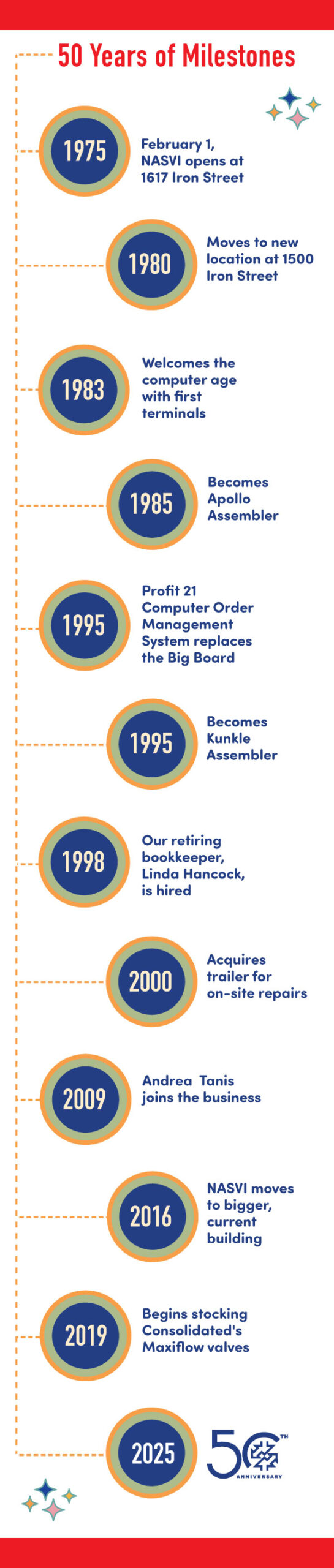This timeline marks a proud moment in NASVI’s history — 50 years of supplying, servicing and supporting industrial safety valves across a wide range of industries. From our first location in 1975 to our modern facility today, our journey has been powered by innovation, dedicated people and a focus on delivering top-tier safety valve solutions.